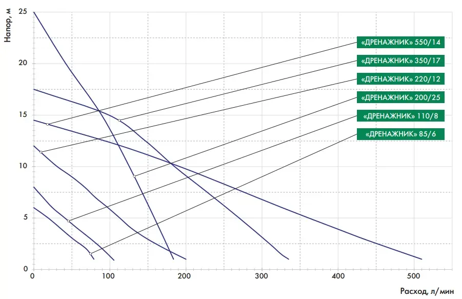 Графические характеристики дренажного насоса ДЖИЛЕКС ДРЕНАЖНИК 220/12