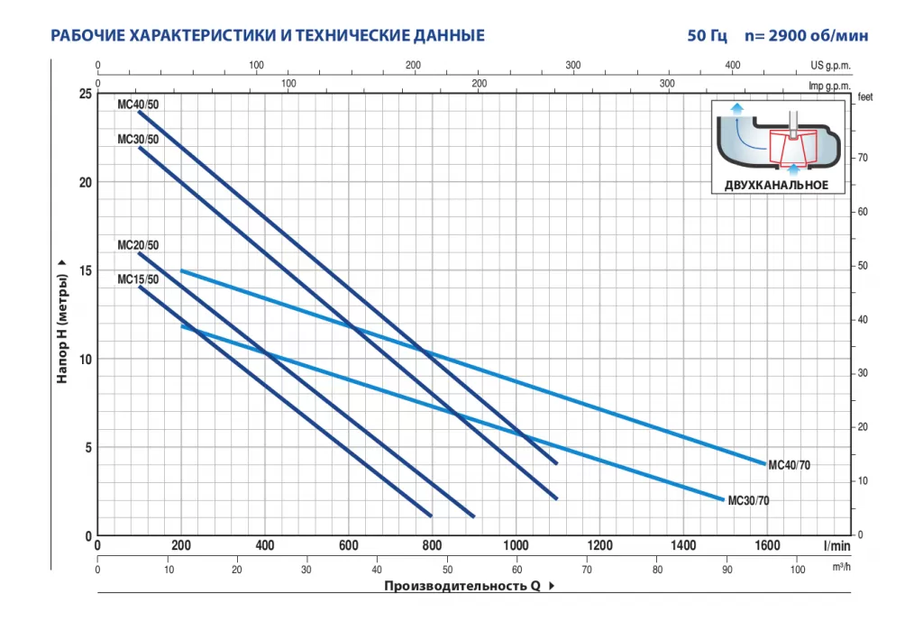 Графические характеристики фекального насоса PEDROLLO MCM 15/50
