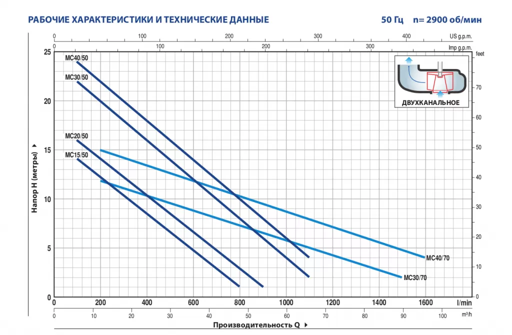 Графические характеристики фекального насоса PEDROLLO MCM 20/50