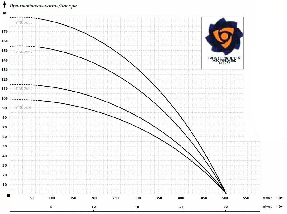 Серия 5SD отличается высокой мощностью – 9200 Вт, что обеспечивает стабильный и непрерывный поток воды даже на большие расстояния. Максимальный напор впечатляет – 185 метров, что делает этот насос идеальным для работы в глубоких скважинах. При этом максимальный расход воды составляет 30 м³/час, обеспечивая быстрое заполнение резервуаров и удовлетворение потребностей домохозяйства.