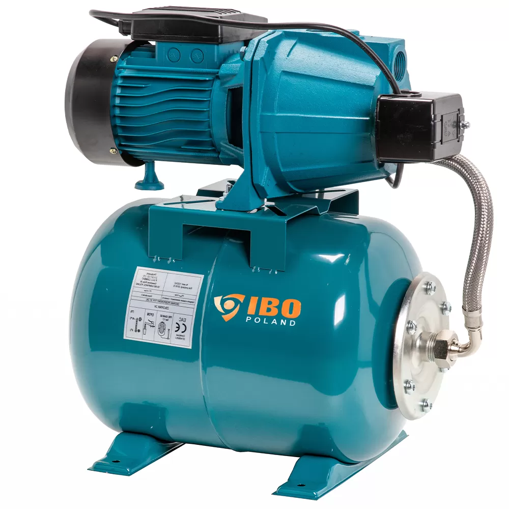 Одноступенчатая, самовсасывающая, насосная станция от Польского производителя IBO JET 100A TF 24л, оснащенный системой, увеличивающей мощность всасывания благодаря использованию трубки Вентури, предназначен для перекачивания чистой, холодной воды из собственных водозаборов и повышения давления. Максимальный забор воды до 8 метров, максимальный напор гидрофора 50 м, максимальна производительность 3.6 м³/час. При этом насосная станция обладает сравнительно не большой мощностью 1100 Вт. На насосной части установлена система автоматики на базе реле давления, защита от работы без воды в насосе нет. Насос установлен на баке объемом 24 л, которы предохраняет насос частых включений / отключений и компенсирует гидроудар в системе водоснабжения. Корпус насоса изготовлен из прочного чугуна, а двигатель оснащен тепловой защитой. Насос имеет шнур питания с вилкой 0.5 м. Насос также доступен с аксессуарами или в гидрофорном комплекте.