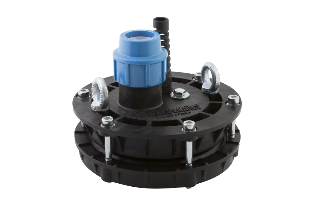 - В крышке впрессован цанговый зажим из латунного сплава для ввода пластмассовой напорной трубы вывода воды;