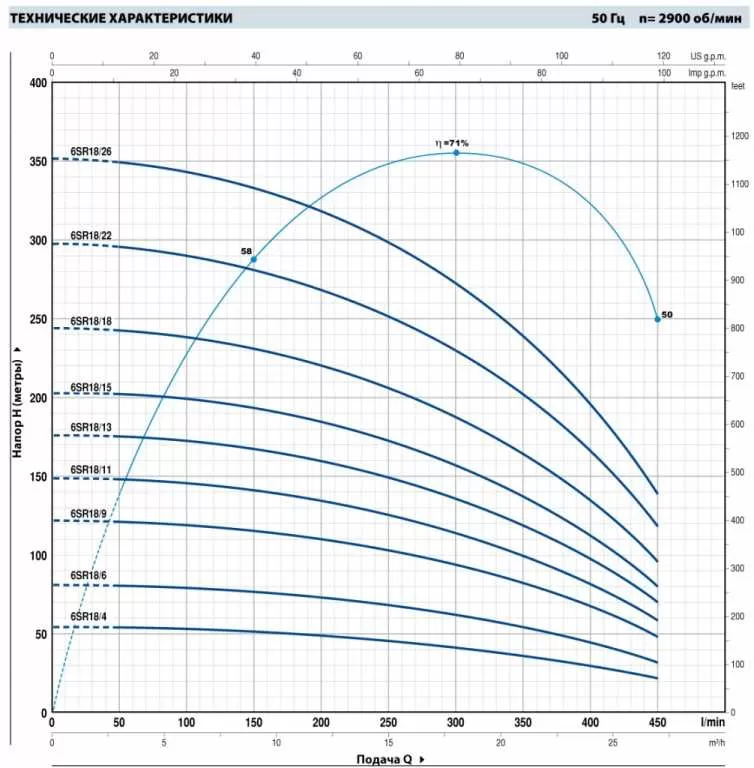 Глубинный насос Pedrollo 6SR18/9-P, отличается объективной ценой и надежной работой всех исполнительных механизмов. Насос Pedrollo 6SR18/9-P достаточно простой в эксплуатации и обслуживании, поэтому отлично подходит как для домашнего, так и промышленного применения.В основе работы Pedrollo 6SR18/9-P лежит конструктивно простой, но функционально успешный многоступенчатый центробежный принцип. Электрический двигатель подключается к агрегату через суппорт, в соответствии с нормативами международного стандарта NEMA. Мощность электродвигателя насоса составляет 7500 Вт . И при таких показателях мощности насос обладает максимальным напором в 122 метров и максимальной производительностью 27 м3/час. Функционирование Pedrollo 6SR18/9-P идентично большинству устройств, основанных на центробежных механизмах подачи воды. Жидкость втягивается в корпус устройства благодаря центробежной силе, создаваемой рабочими колесами, которые также проталкивают воду через все тело насоса "диаметр насоса 6"", а затем в нагнетающий патрубок "диаметр патрубка 3"", через который вода и попадает к конечному потребителю. Главной особенностью насоса Pedrollo 6SR18/9-P является малый диаметр корпуса агрегата, а также то, что перекачиваемая вода не касается стенок двигателя. Между жидкостью и корпусом движущей установки располагается прослойка из технологического масла, которая и предотвращает попадание мелких частиц непосредственно в исполнительный механизм. В то время как охлаждение электропривода происходит за счет верхнего способа забора воды, т.е. перекачиваемая жидкость находится всегда выше уровня расположения двигателя. Насос питается от сети в 380 в и комплектуется кабелем 4 метров.
