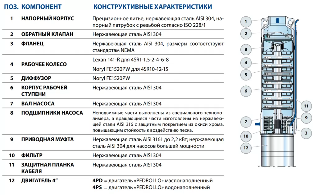 Устройство насоса Pedrollo 6SR18/9-P: